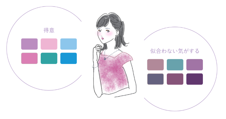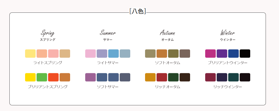 如:診斷出適合夏季的人有可能不適合霧感的色彩,透由八型色彩可釐清顧客真正的適合色。 圖片來源:https://happyspiral-academy.com/eight_color/