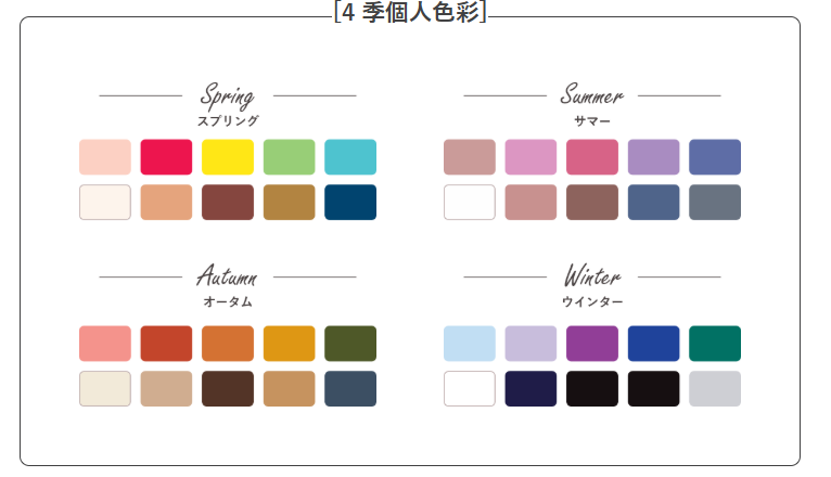 四季個人色彩 Personal Color 發源自美國,再由美國傳播到世界各地,而日系的個人色彩起始於1980年至今,依四季景色意象組合的“春,夏,秋,冬”季節色彩運用至人類個體的方法,讓身上所穿著的色彩,在個人的形象上產生良好的變化,其變化可分為兩大方向: