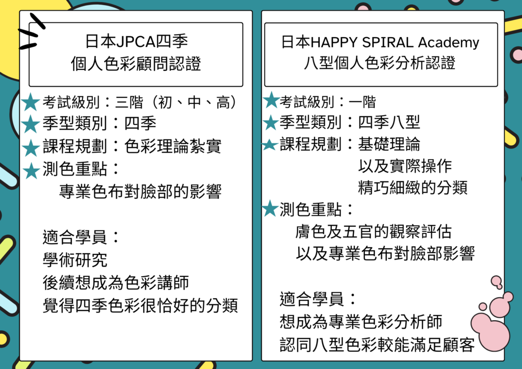 此培訓課程分為初級、中級、高級顧問課程。課後可在台灣考取「日本JPCA個人色彩顧問」初/中/高級的國際證照。